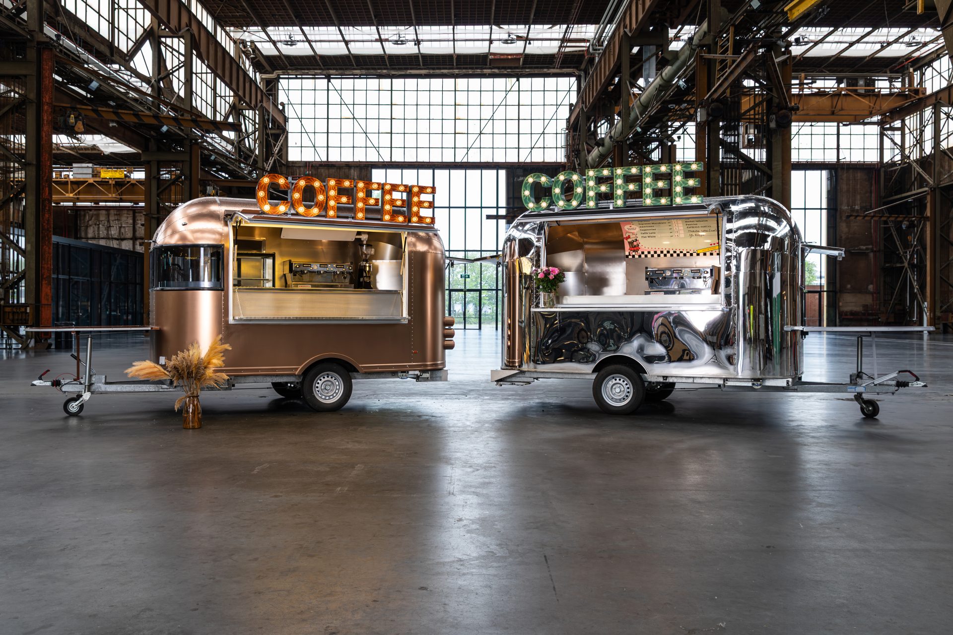 Deze compacte trailers in de kleur Chrome en Brons zijn echte eyecatchers en perfect voor kleinere locaties. De Compact Trailers zijn volledig uitgerust om jouw gasten te voorzien van heerlijke koffie en thee.